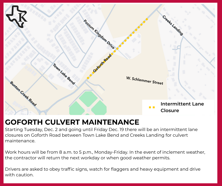 The City of Kyle appreciates residents’ patience and understanding as this important preservation effort takes place.